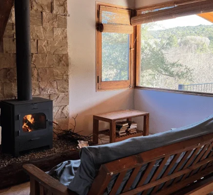 Por otro lado, la zona de estar y el comedor son sencillos y acogedores, con una mesa para ocho personas, un futón, una mesa de centro y una salamandra de leña para los días frescos.